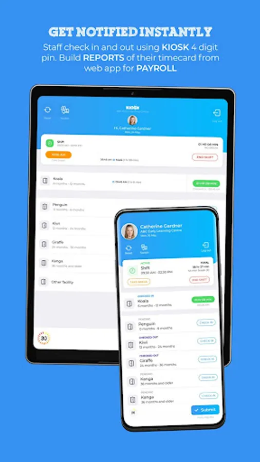 • Staff can check in to the centre and rooms and record break times.