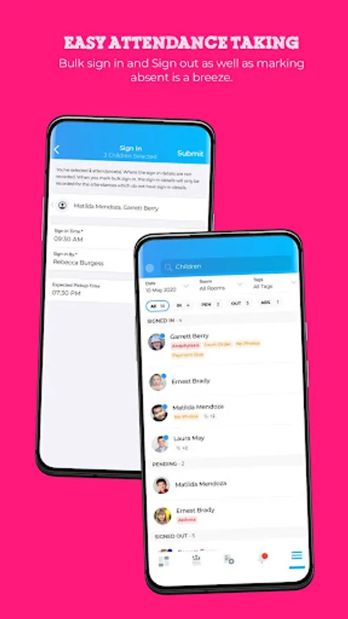 • Educators can check in children in bulk, record drop-off and pick-up