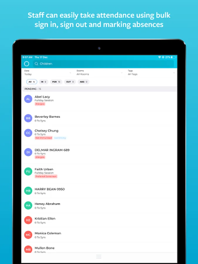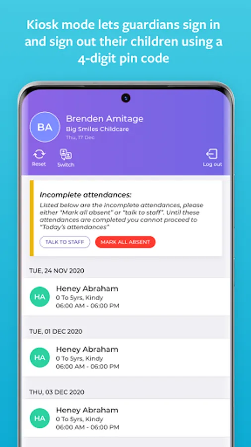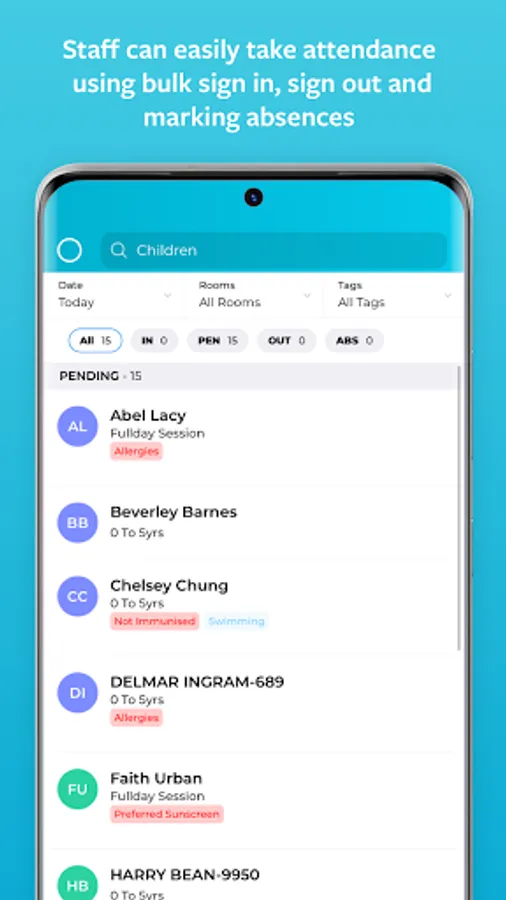 A digital attendance system performs daily audit logs, and can trace sign-in and sign-out times, right down to the very second. Using just a mobile number and PIN number, families can quickly check-in their children using their own device. For simple attendance tracking, you will love being able to record and manage absence records, with the ability to also add notes. When parents use the sign-in app, you can provide them with billing alerts and announcements. No more having to call, email or find them at drop off and pick up times!
