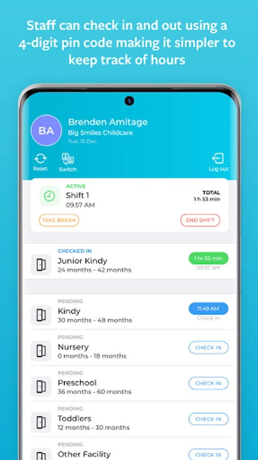 The kiosk feature can also be used for staff to sign in and out with each day. No more printing off, and gathering mountains of paper each year. Say goodbye to processing timesheets and payroll. Using the kiosk feature for staff to sign-in and out, means that staff breaks and total hours worked are automatically calculated. You can also easily export these as reports for payroll systems.