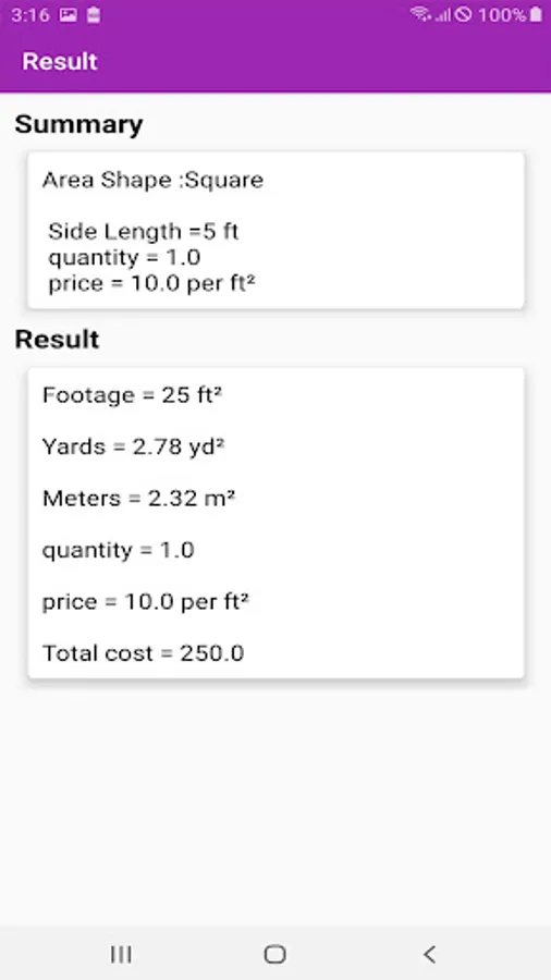 You can get results of labor cost, cement cost, sand cost, aggregate cost and Total cost.