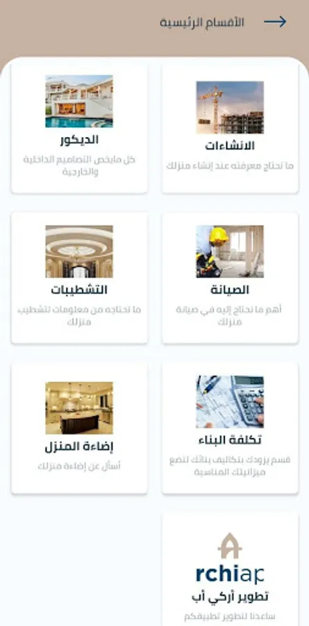 ArchiApp is an application that cares about building your home in the most beautiful way, keeping up with the latest designs, with the help of skilled professionals and interested in the quality of your buildings, and enables you to reach, consult and contract with them while you are in your home from any country they are.