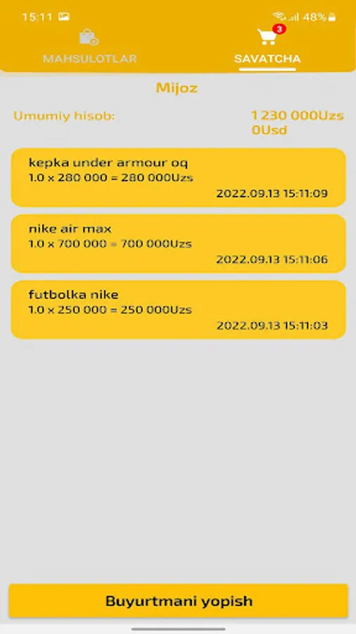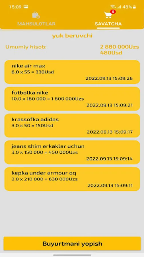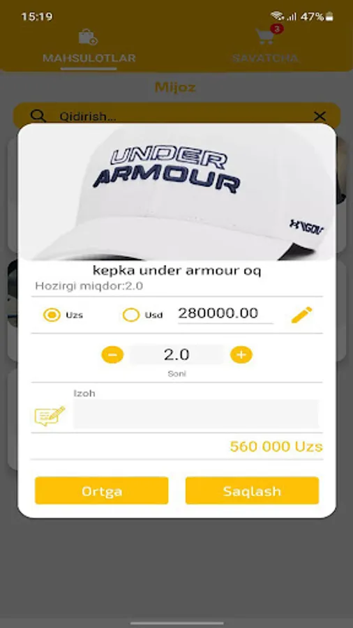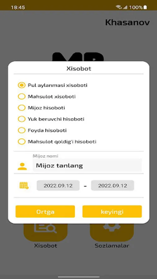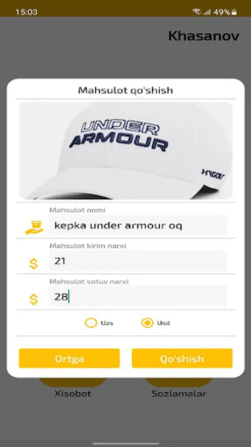 my business, does all the accounting books in the business. Through this application, the current balance of purchases and sales of products in the business, debts, cash flow report for different periods of time, product turnover report, report on the rights and debts of customers and consignors, current product balance report, cash report and you will be able to view the general profit reports. It is also possible to make discounts on the sale and purchase of products, trade in Uzbek sums and US dollars, and sell products on credit. Information between several persons, example: debts, determination of product balance