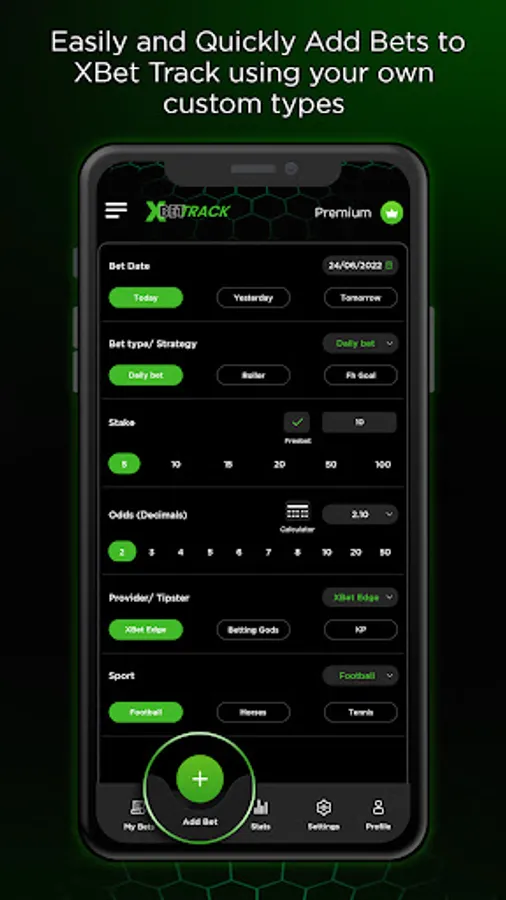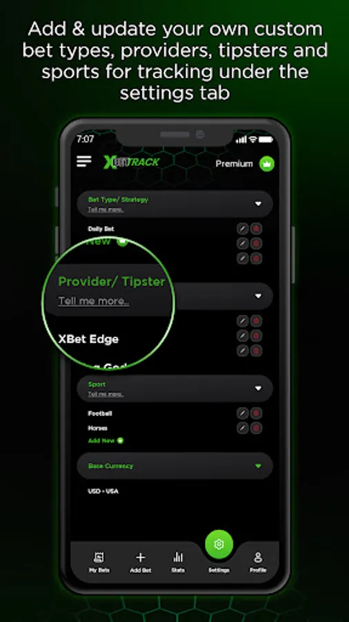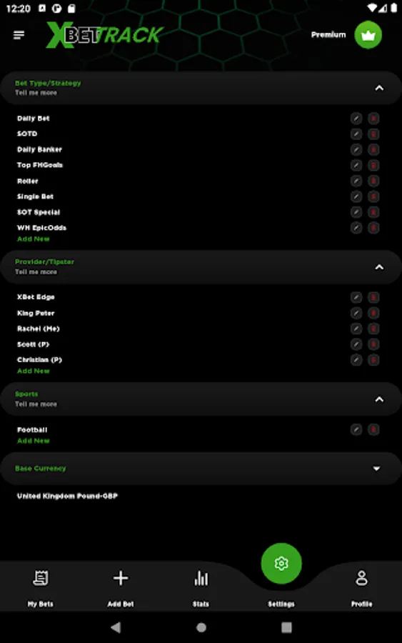 This app allows you to add your own custom bet types where you can customise them with your personalised strategies. You can also add providers/tipsters that you are following and sports for tracking.