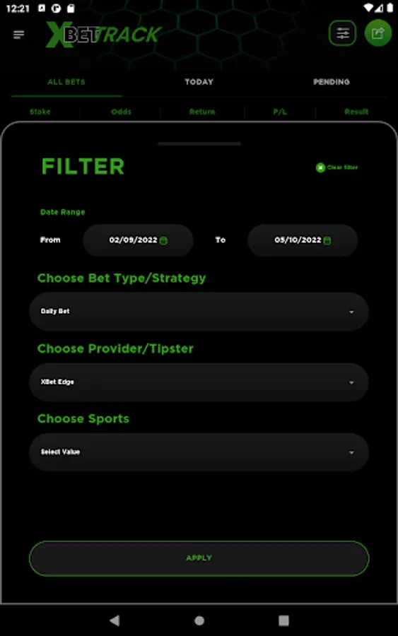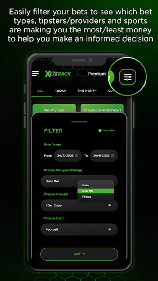 • Filters will enable you to see the statistics and show you which bet types, providers/tipsters or sports are most/least profitable for you.