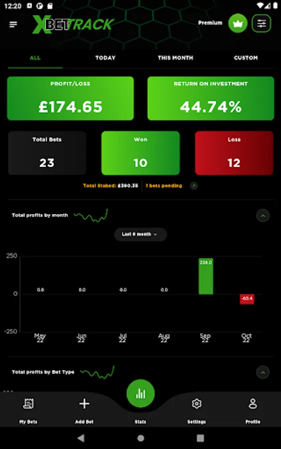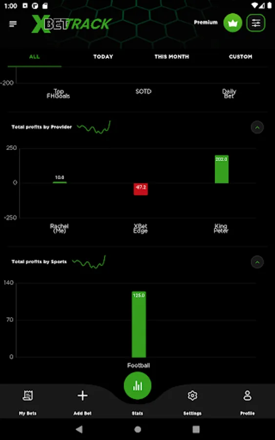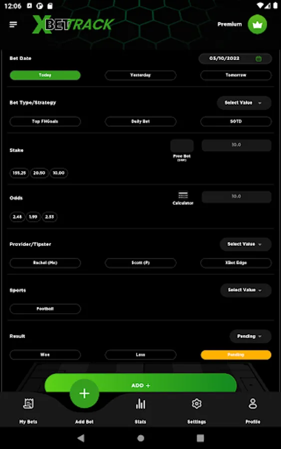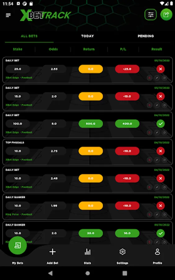 Strategies like Daily bet and SOTD from the XBet Edge app, highest goal, ACCA betting, daily banker , Trixie etc. , Providers /tipsters like XBet Edge, Betting gods , RachelsBB , Nates Horses. Sports like Football, Horses, Greyhounds, tennis etc. you can then set a stake , your final odds & the final result afterwards and watch the magic happen on the stats screen.