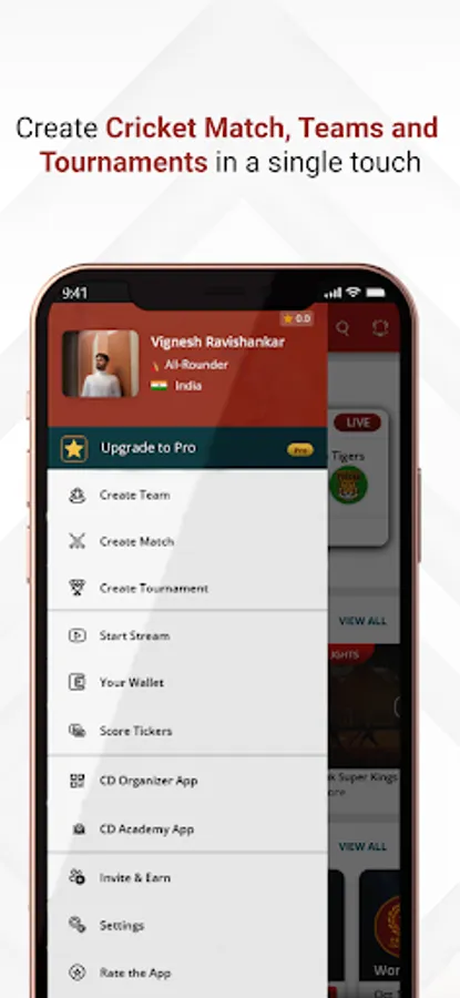 1. Create Cricket Teams, Matches, and Tournaments quickly and as soon as possible.