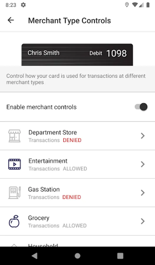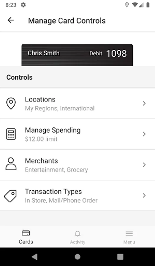 Spending limits can be established to allow transactions up to a certain dollar amount and decline transactions that exceed your defined thresholds. Transaction can be monitored and managed for specific merchant category (gas stations, restaurants, entertainment, travel or retail stores) and by merchant type (in store purchases, e-commerce and ATM transactions).