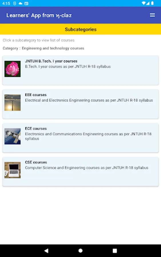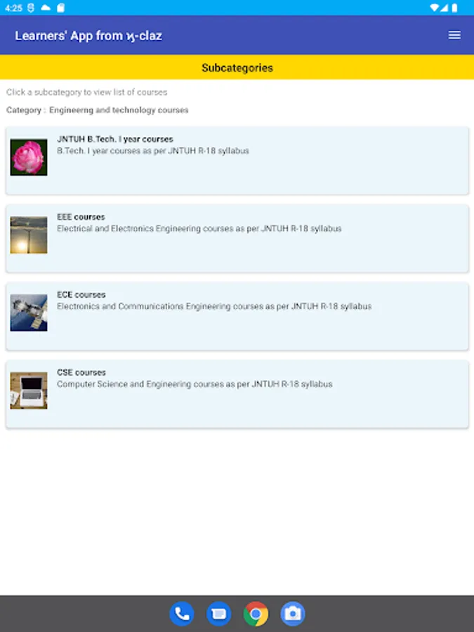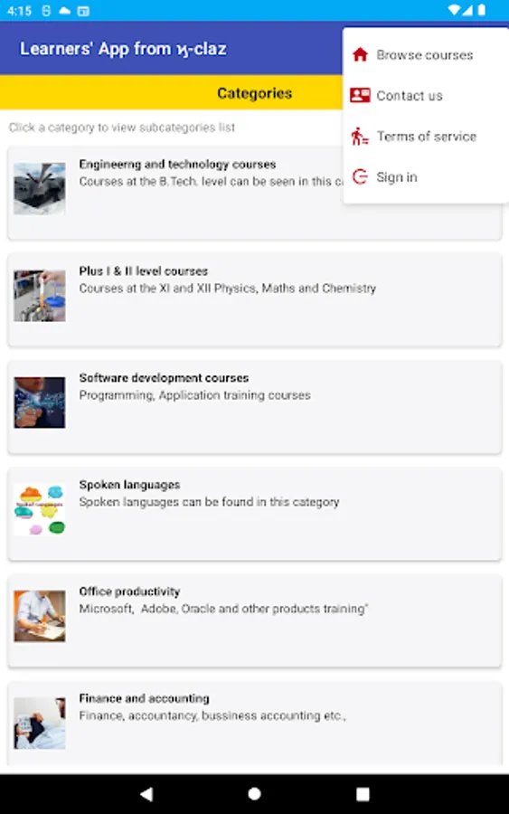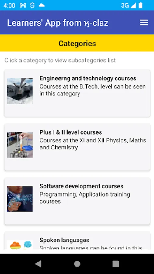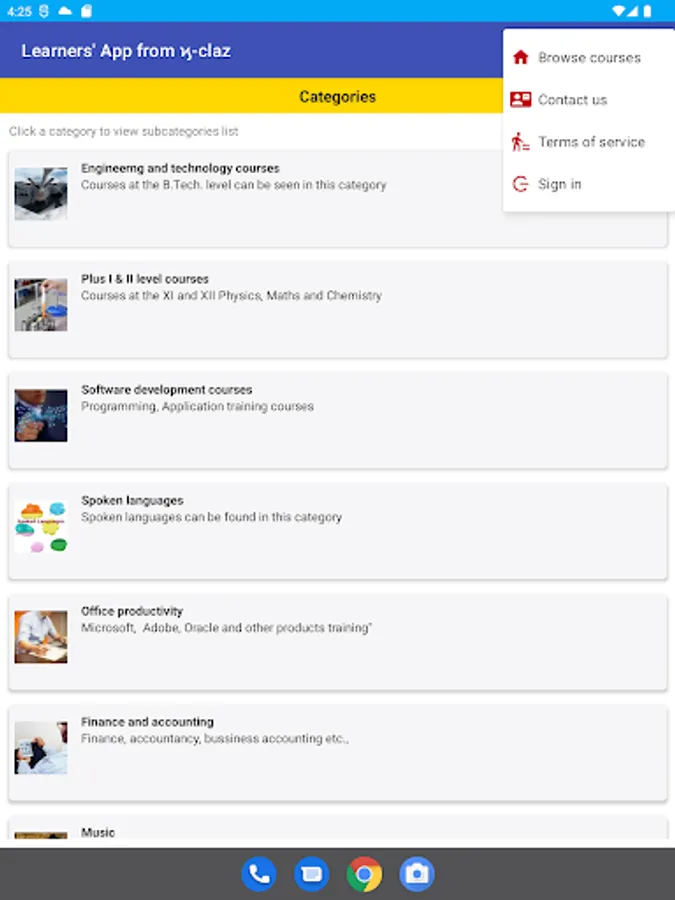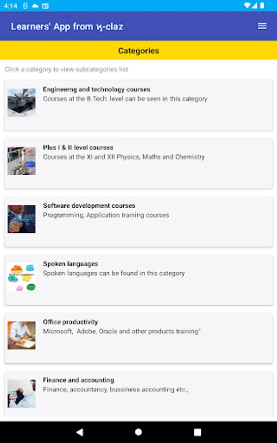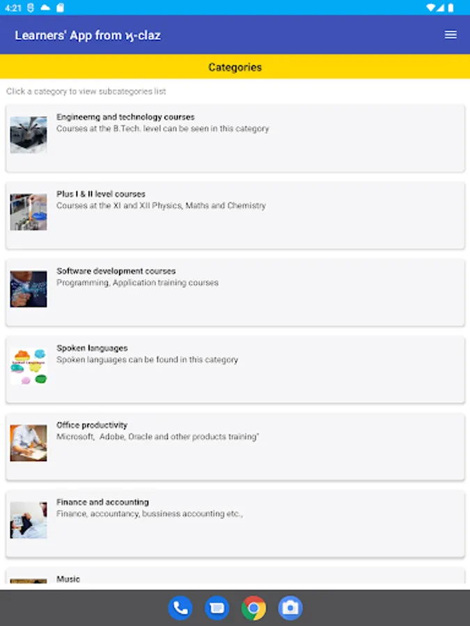 The Learners’ app from 'chi'-claz is an android application for online learning. A variety of self paced online courses in different course categories are offered on this platform. The course categories include : Engineering and Technology, Plus I and II level, Software development, Spoken languages, Office productivity, Finance and accounting, Music and University level courses in Science. You can try our courses before enrolling. Course contents include recorded video lectures, live streaming session, quizzes and advanced quizzes.
