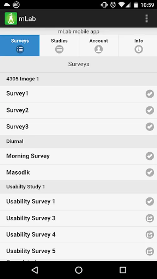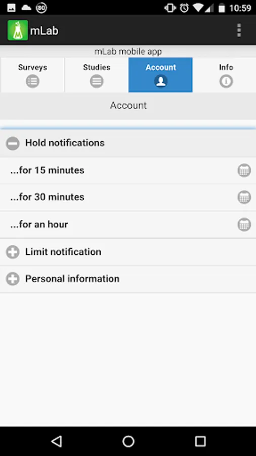 mLab is a mobile client used for connecting users to online survey sites. Users who sign up for the mLab panel and install the mLab app receive participation alerts when their participation is requested. Selecting a notification will open the app which includes an embedded browser. The browser then redirects to a third-party website hosting the online survey (e.g., Qualtrics). Once the participant has completed the survey, it will redirect back to the app, which will list other available surveys. The app will play a custom sound on notification so that users’ can easily distinguish our notifications from those of other apps and choose to participate or not based on their immediate circumstances.