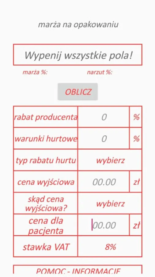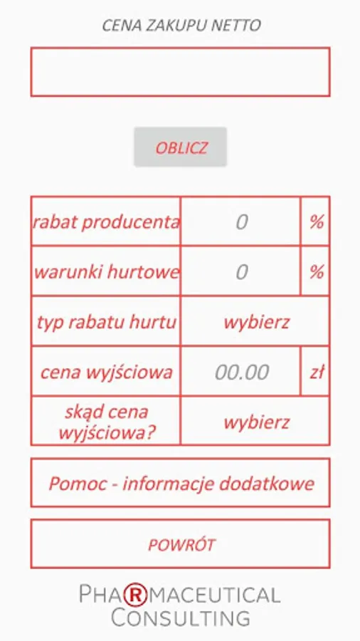 An indispensable tool for everyone working in the pharmaceutical industry. Calculator based on current, most commonly used methods for calculating purchase prices, value margin and percentage of pharmacies. Created by practitioners who work in pharmacies, pharmacy chains and wholesalers. It will be useful for people from sales, marketing, manufacturers, pharmacists and representatives of pharmacy chains.