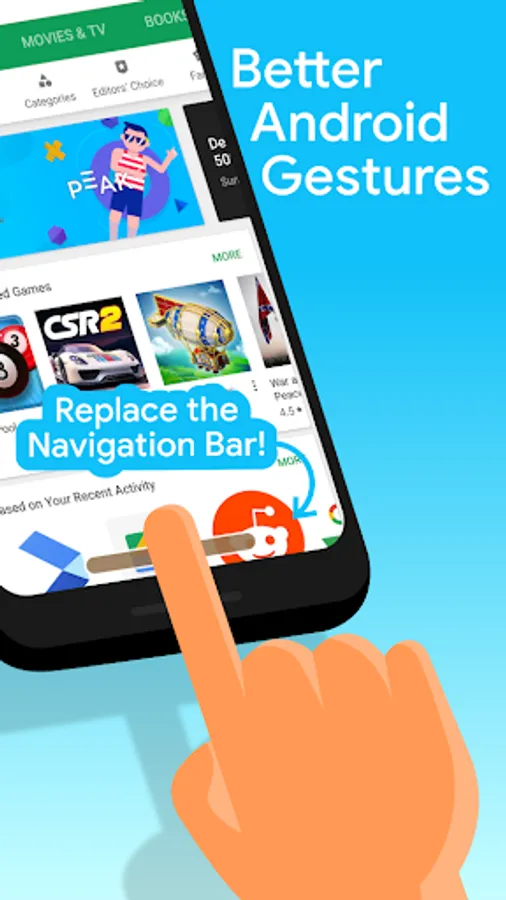 With Navigation Gestures, you don't have to buy a new phone or wait for the next Android update to get swipe gesture controls. Navigation Gestures brings swipe gestures to any Android device! Replace the navigation bar buttons and get gesture controls with Navigation Gestures!