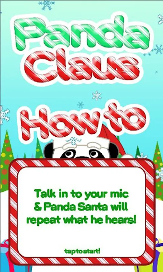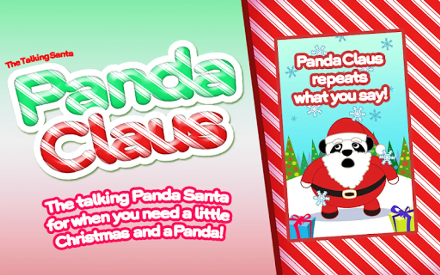 Panda Claus is spreading Christmas cheer. He likes to repeat what you say to him in a deep panda voice. Talk to the panda Santa Claus and he will say it back to you. Make him say funny things and laugh. You can make him say anything. Just speak to him and he talks back in a funny Panda Claus voice.