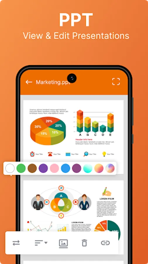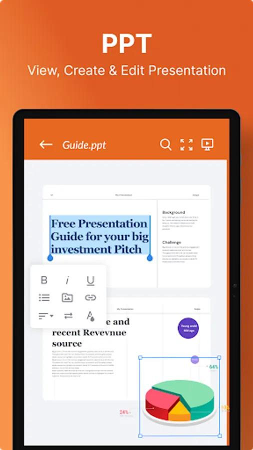📙 PPT reader & Slide Editor - You can use this app as a PPT Reader or Presentations editor as well. You can create new presentations - edit text or add text, add images highlight, draw, and Convert PPT to PDF. Print & Share options allow you to share slides with others. You can read all presentation formats such as PPT, PPTX, PPS, PPSX, etc.
