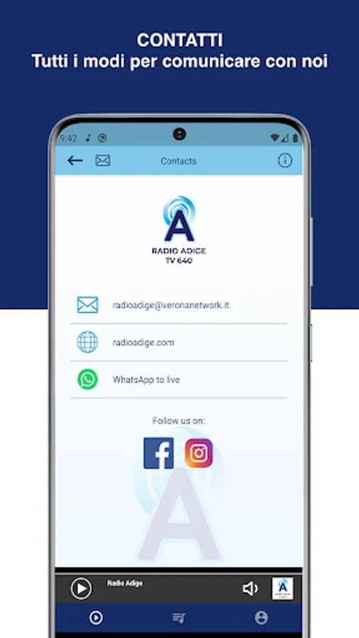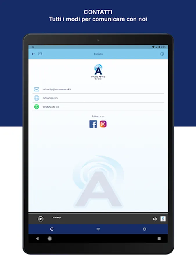 Download the free app of Radio Adige - the radio of Veronesi on your smartphone: only large Italian and international hits and local information. You will be constantly informed about news, current events, sports, entertainment, with updates on traffic and Province of Verona.