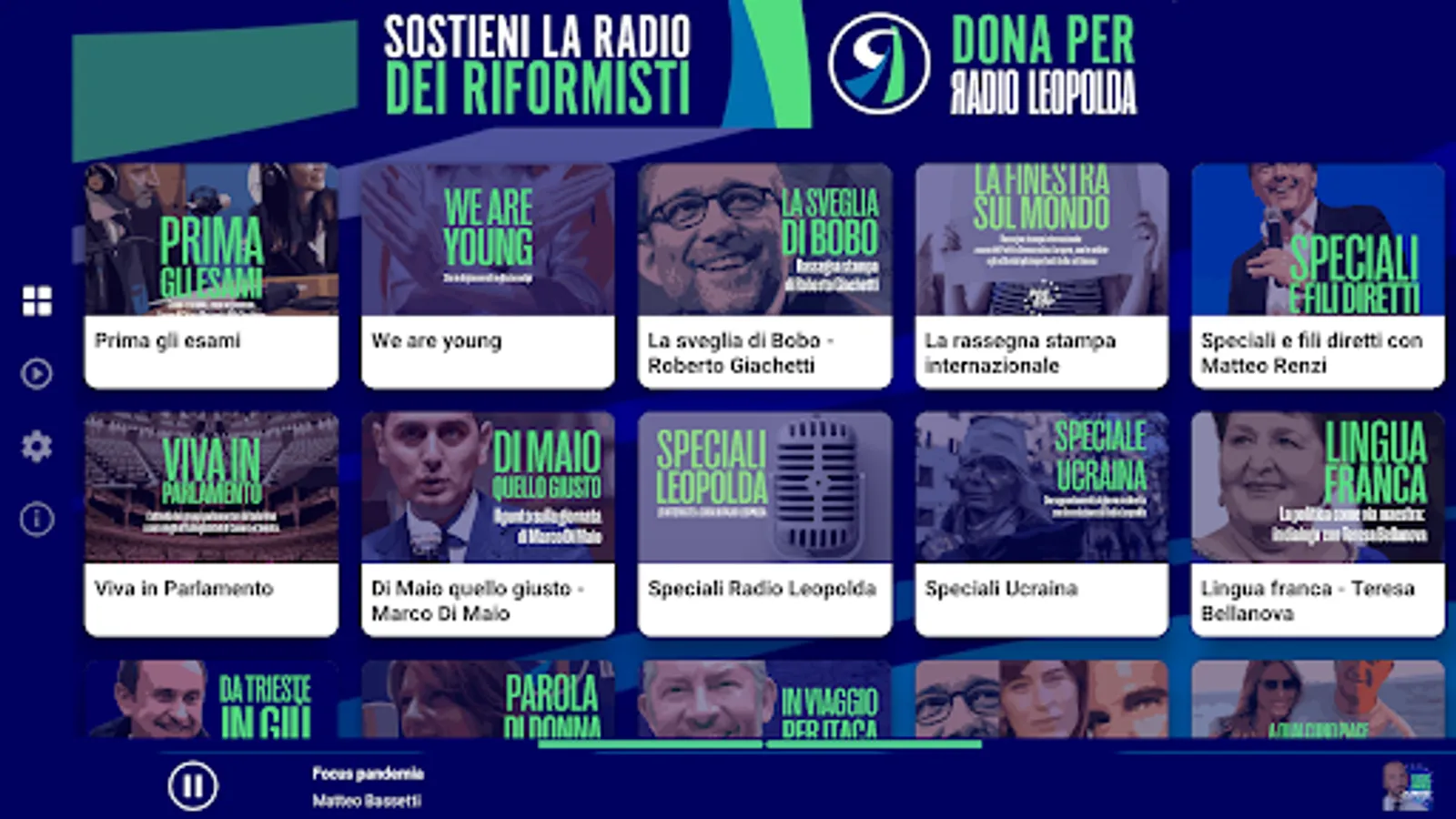First version of the app of Radio Leopolda, the radio of Italia Viva. From the Stazione Leopolda in Florence, a historic appointment of Italian politics, to the web waves Radio Leopolda brings you live and podcasts by Matteo Renzi, Roberto Giachetti, Marco Di Maio, Ettore Rosato, Teresa Bellanova and the whole world of Italy to your smartphone Viva.