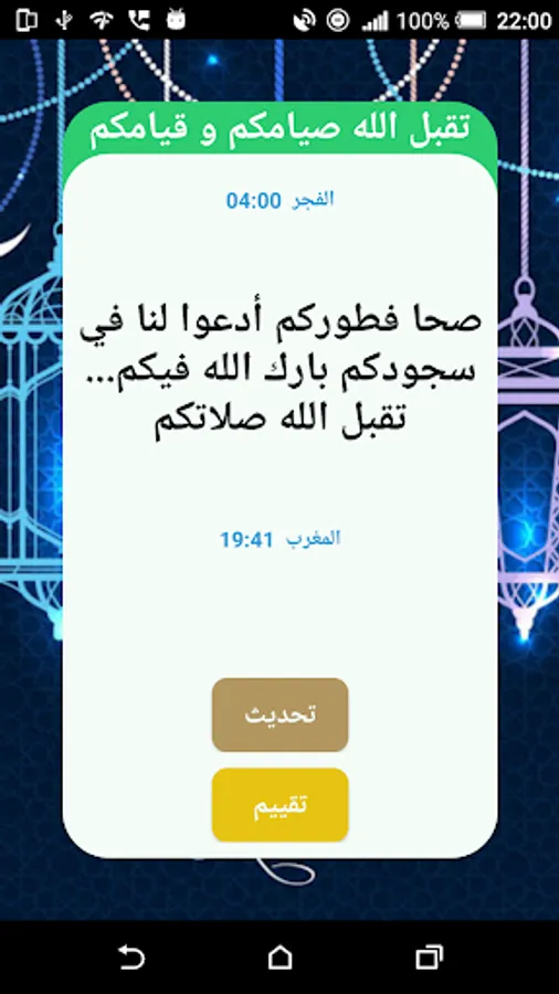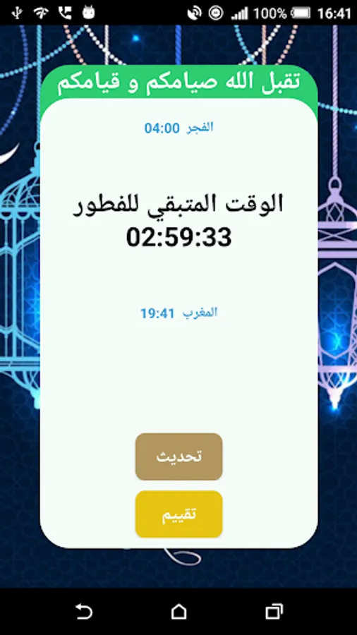 Ramadan fasting is an application that allows you to know what keeps you either for breakfast or the remaining time to the end of sahur time and, of course, depending on where you live or the site that you are in now with the possibility of time display Maghrib prayer and Alfjro other benefits.