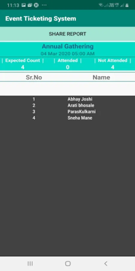 4. View status - display details of selected event and share report on WhatsApp in pdf format.