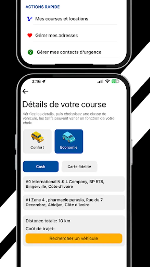 Notre application de commande de véhicule offre également des options de paiement flexibles, y compris le mobile money, le paiement en espèces depuis votre portefeuille digital.
