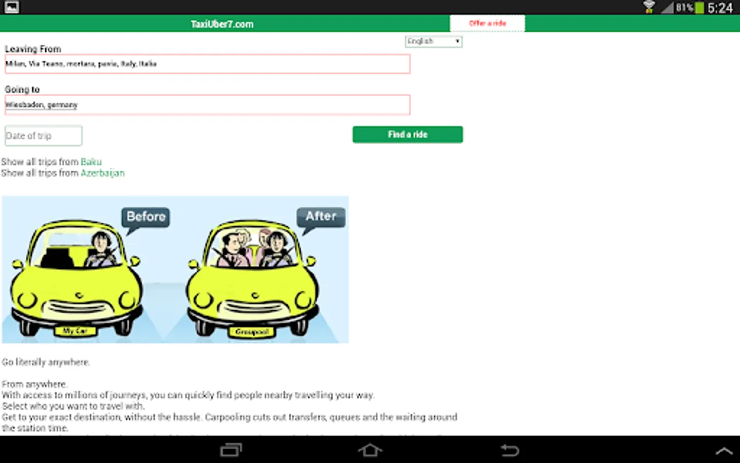 Share rides with someone going your way. Find rides at your doorstep. Get away for the weekend by carpool, bus or car. Travel how you want - carpool, bus - the choice is yours with millions of rides on Blataxi at your fingertips!