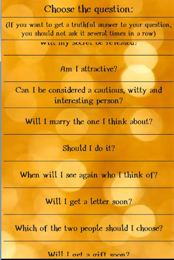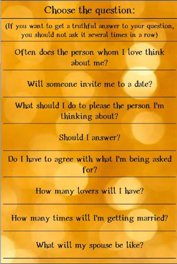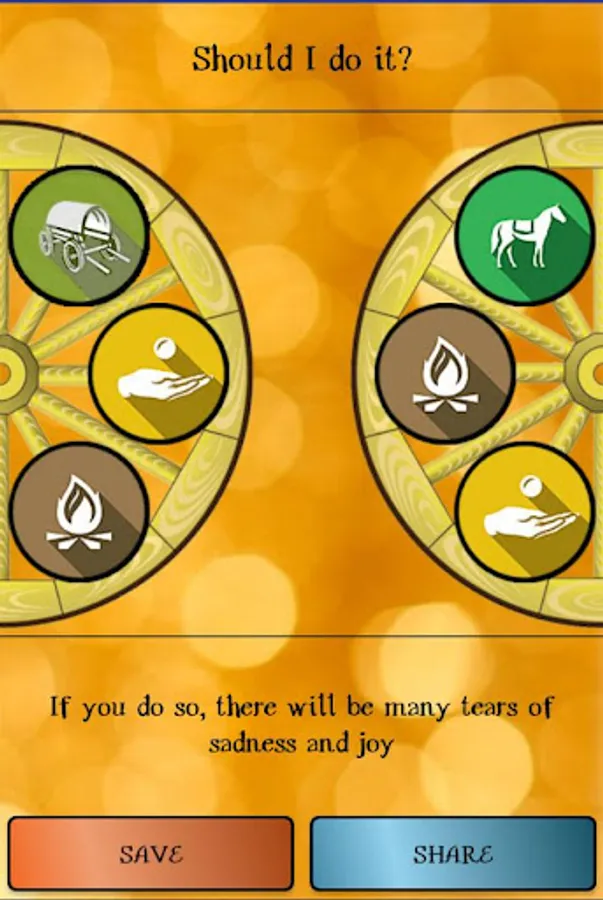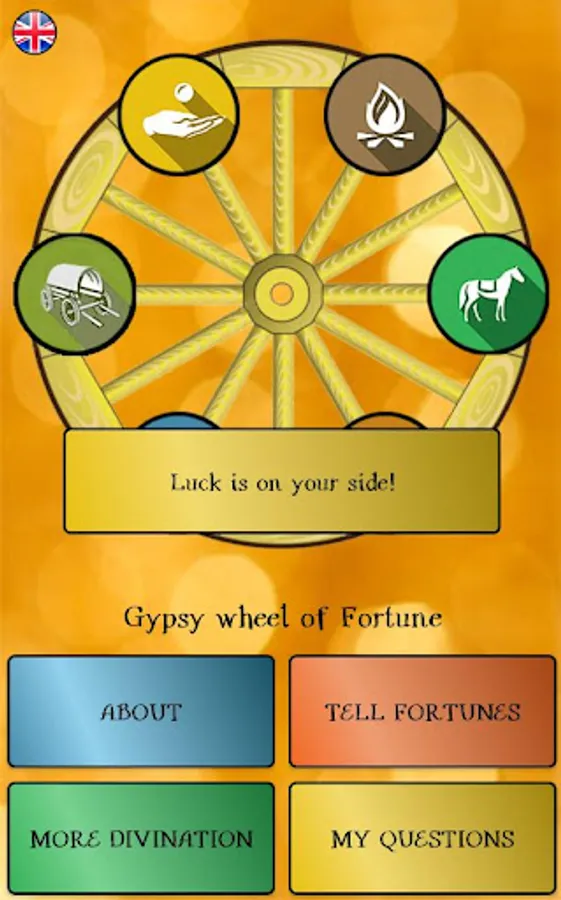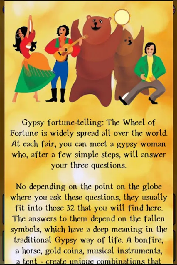 You ask any of the proposals question 32 (16 in the basic version), rotate the two wheels and get the answer. It depends on symbols that have deep meaning in the traditional Gypsy way of life. The fire (hearth), a horse, gold coins, musical instruments, wagon - create a unique combination that accurately predict your future.