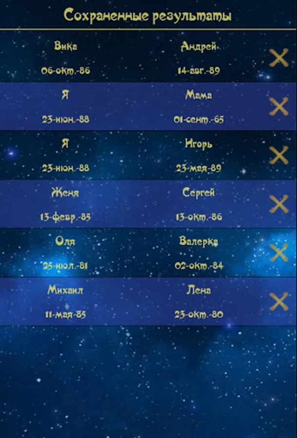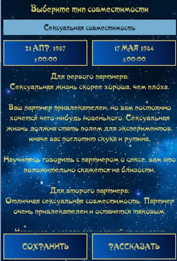 The application publishes complete information about the main points of compatibility of partners in the simplest and most accessible presentation. We took the most significant points of the horoscope for relationships and automated their calculation. Now there is no need to understand the cumbersome interpretations that traditional programs for calculating synastry give: in the application you can reliably find out astrological compatibility by dates of birth from 1900 to 2030.