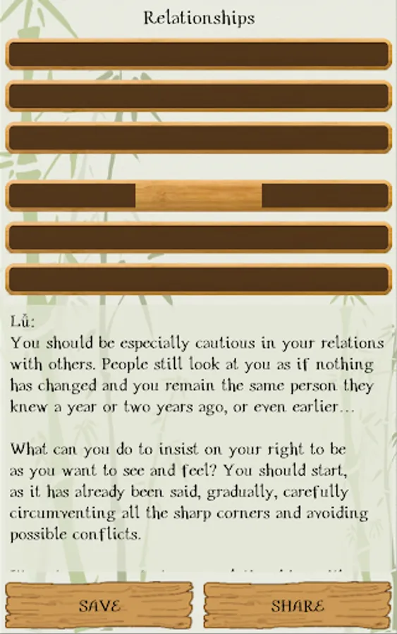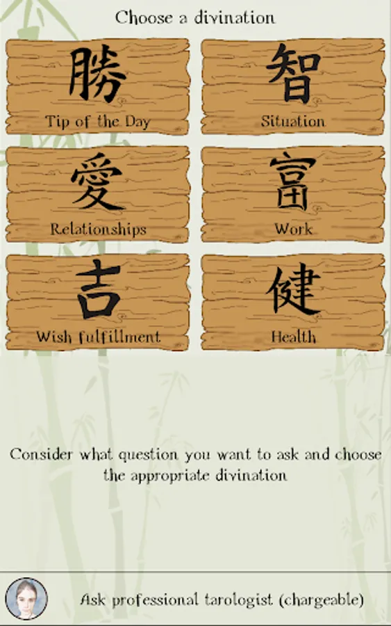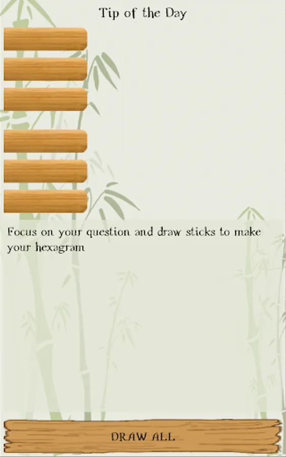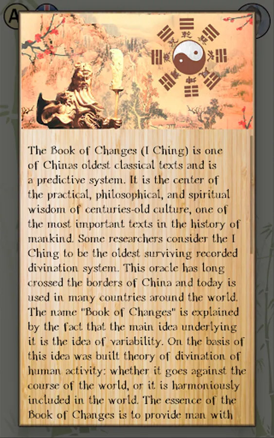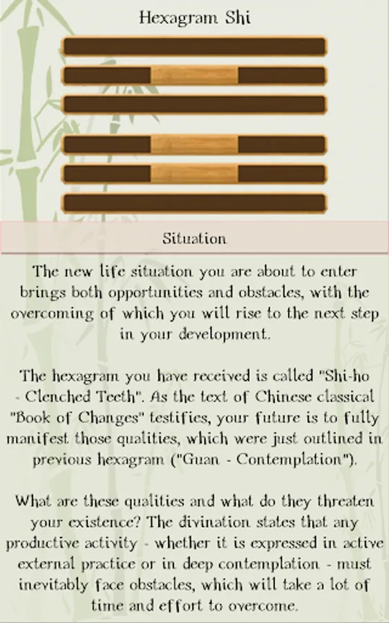 In our application the system of fortune-telling "I Ching" is set out as simply, practical and user-friendly as possible. "The Book of Changes" is a way of comprehension, analysis of the situation, it pushes to the right actions and actions. Now you can ask your I Ching questions at once, without delving into theory and without complicated preliminary preparation.