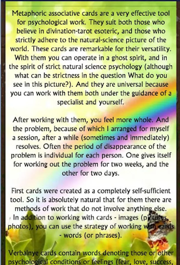 Metaphoric associative cards are international and can be used in all cultures, for all ages; They help us to realize a dialogue between the inner and the outer, to bring out the deep material to the surface; They will become a springboard for our fantasy, launching bizarre associations that lead us to unexpected discoveries; Cards will remove the protective barriers of the psyche; Create conditions for self-development and self-knowledge; Can be used in the interpretation of dreams, help find a resource to solve the problem.
