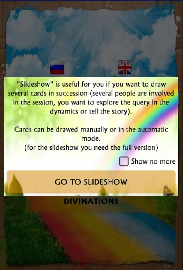 The cards depict pictures with a deep symbolic meaning, directly responding in your subconscious, thanks to the information stored in it. It is not the common sense of the picture that is important, but the associations that it generates exactly from you. Everyone will feel something of their own. Cards will raise unconscious impressions from our subconscious.