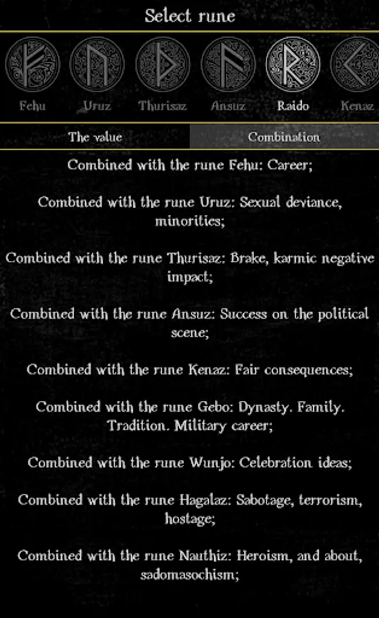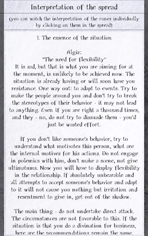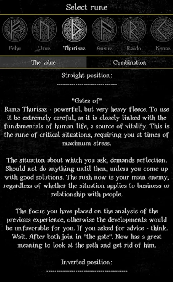 Each rune can be interpreted both individually and in combinations. All descriptions are drawn up professionally and in detail reveal all the details very accurately predict the future and give advice which way is better to choose.