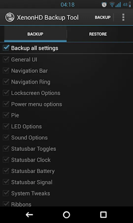 To use this app you must be on XenonHD ROM. This will backup all your preferences such as UI settings, navigation bar settings, lockscreen settings, power menu preferences, quick toggles, notification shortcuts, pie settings, etc!