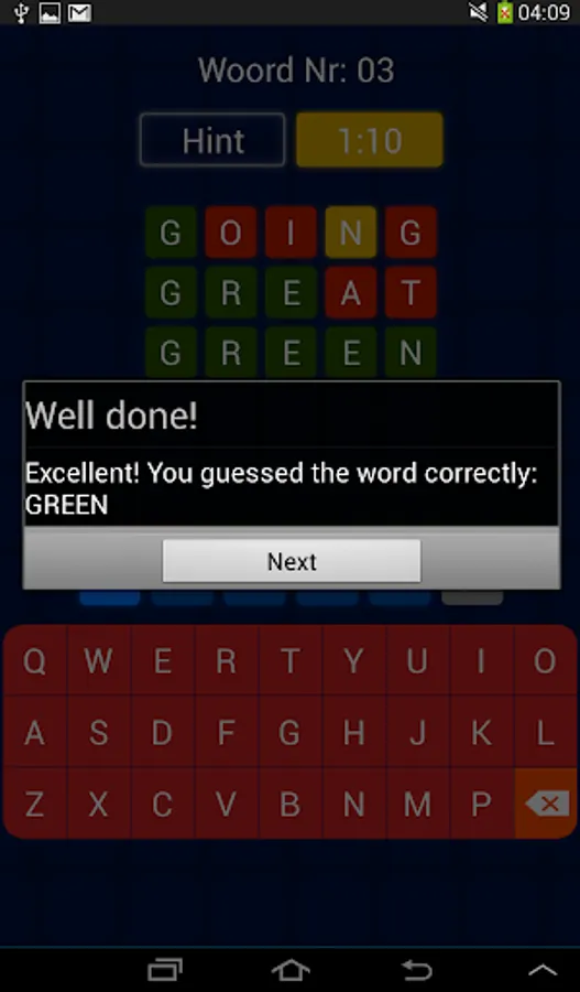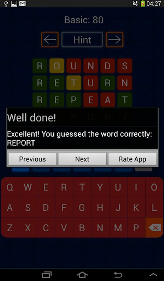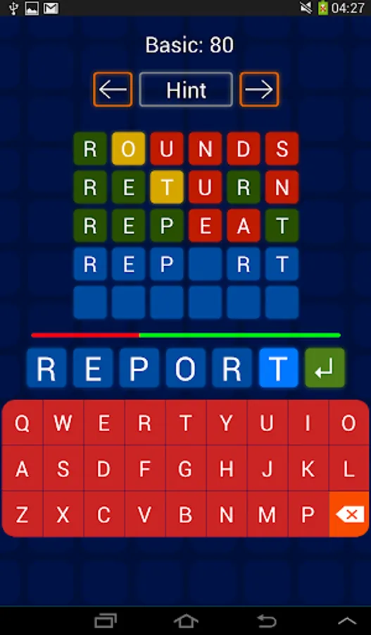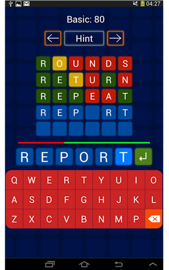 The aim of this game is to find hidden words. Type in letters from keypad (at the bottom of the screen) to enter a word. The letters turn green, red, yellow or grey as you enter a word. Green indicates correct letter at the right position. Yellow indicates a correct letter but at wrong position. Red indicates a wrong letter and grey indicates an invalid word.