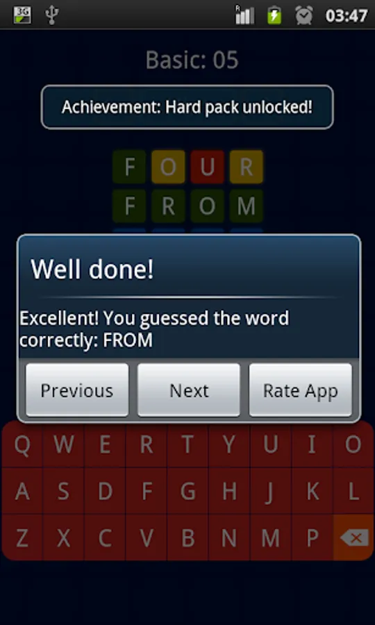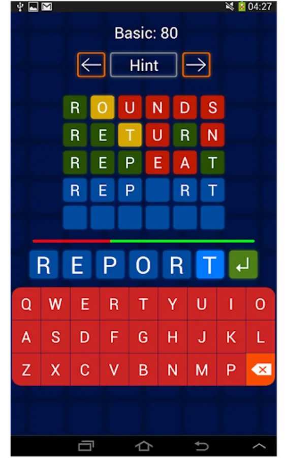 The aim of this game is to find hidden words. Type in letters from keypad (at the bottom of the screen) to enter a word. The letters turn green, red, yellow or grey as you enter a word. Green indicates correct letter at the right position. Yellow indicates a correct letter but at wrong position. Red indicates a wrong letter and grey indicates an invalid word.