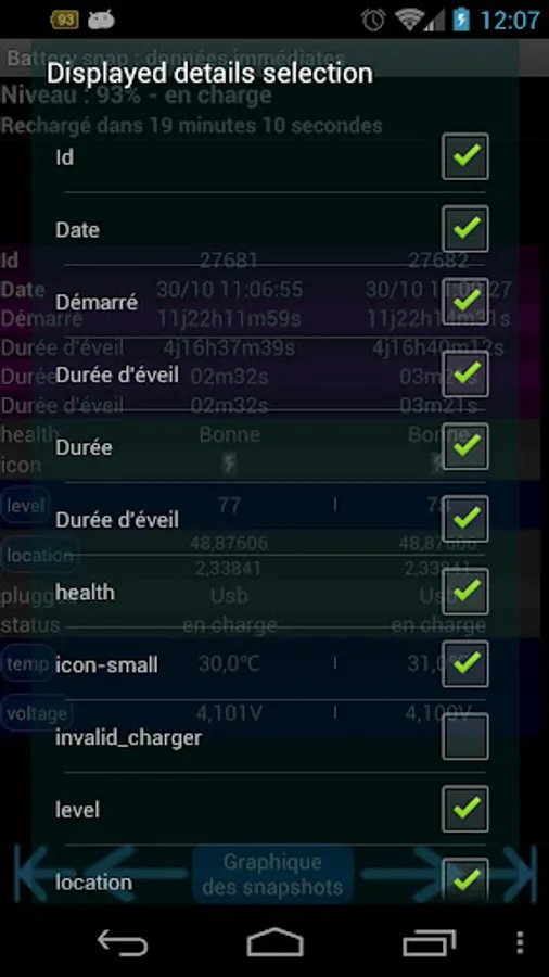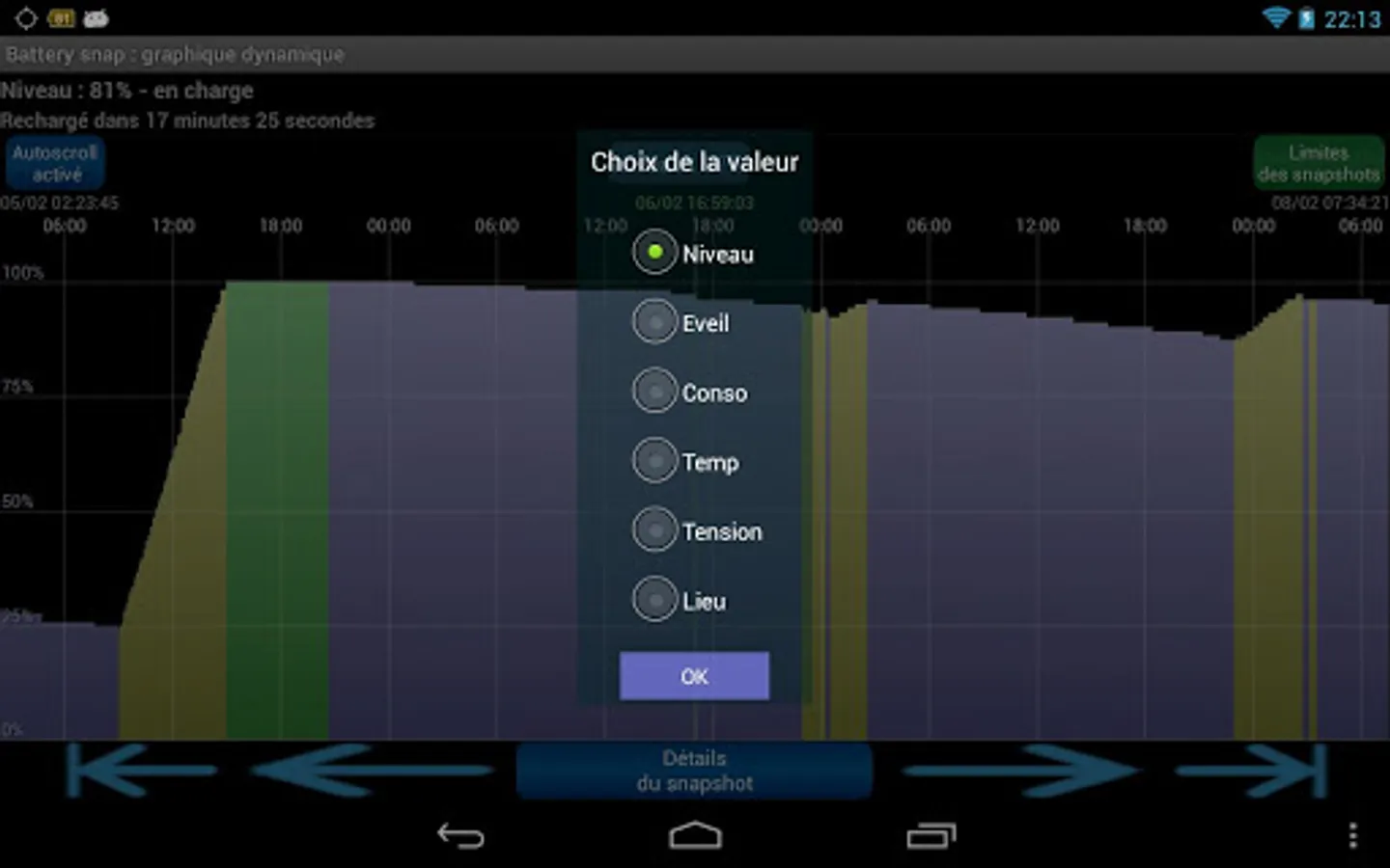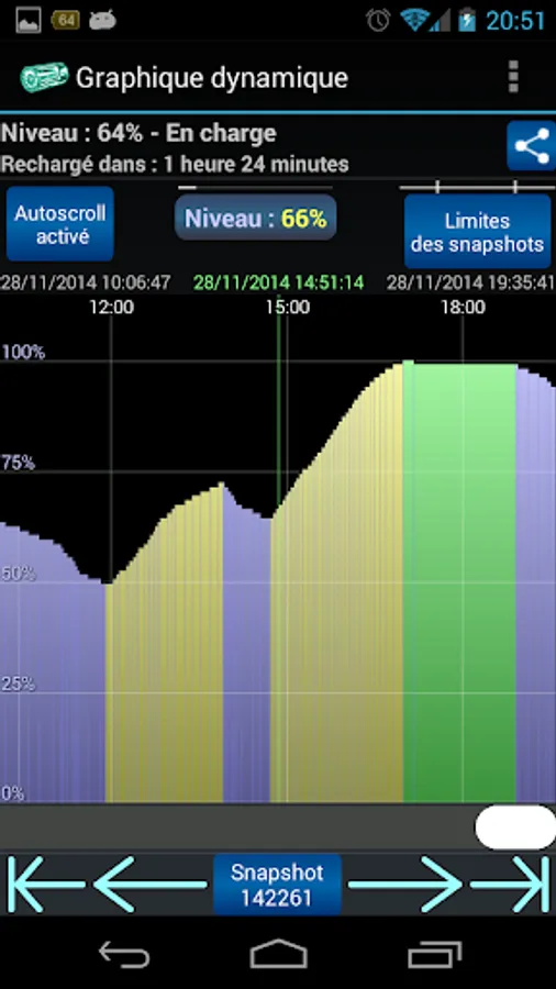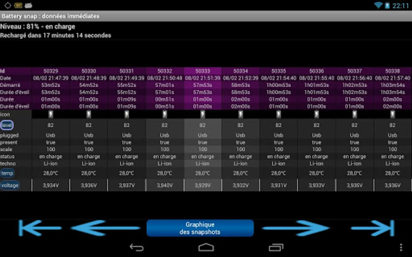 Notice : if you have and Android device using a "battery saver", or running Android 6.0 or greater, and if you see some unexpected flat areas in graphs. This is because "BatterySnap" is prevented to record battery events when the phone is idle. To prevent this, just set an exception for "Battery Snap" so that it is excluded of aggressive battery saving settings.