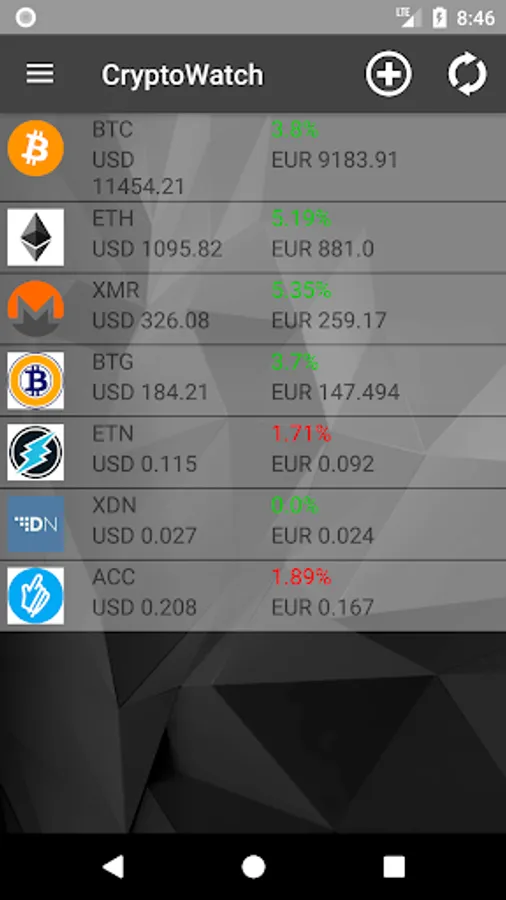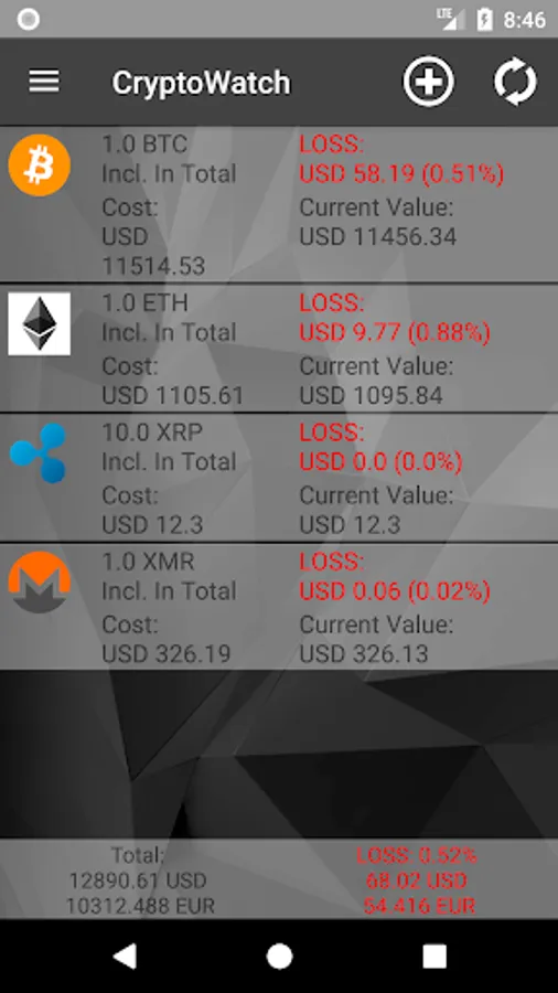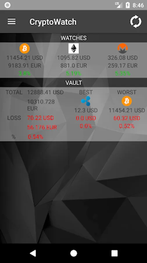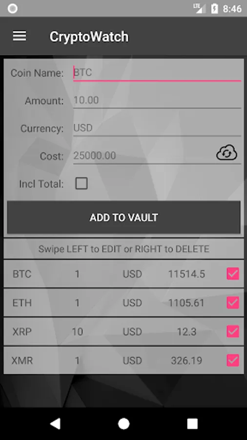 Simply add the coins you have to your "Vault", enter the cost of the coins and CryptoWatch will keep track of their current value, indicating whether you are actually making any profit.