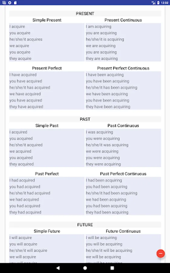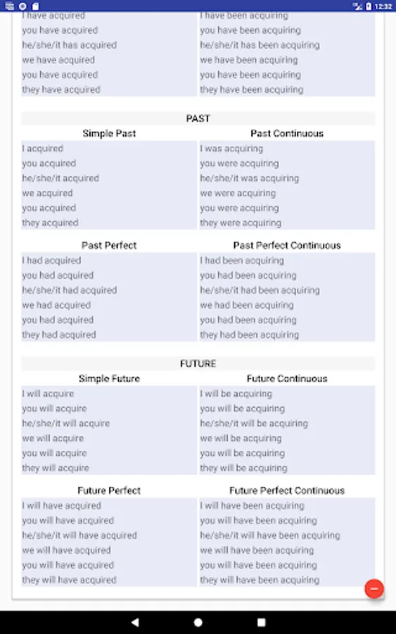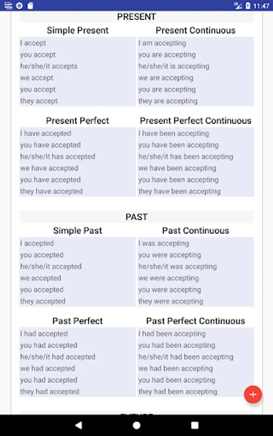 Present (Present Simple, Present Continuous, Present Perfect, Present Perfect Continuous),