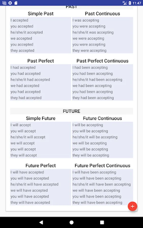 Past (Past Simple, Past Continuous, Past Perfect, Past Perfect Continuous),
