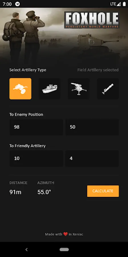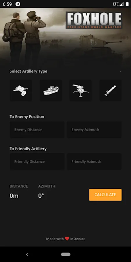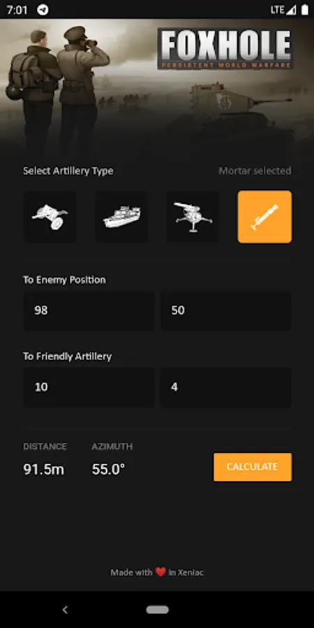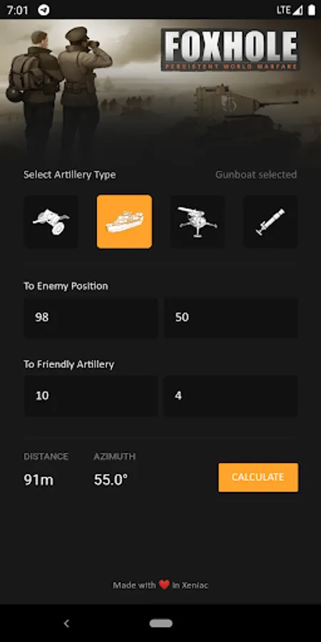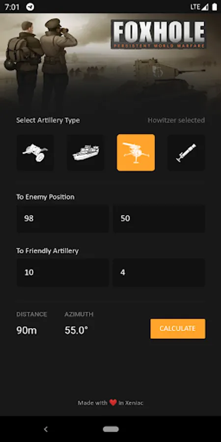 A simplistic calculator for using howitzers, field artillery, gunboats, and mortars in foxhole game.