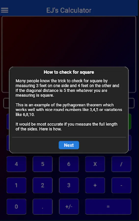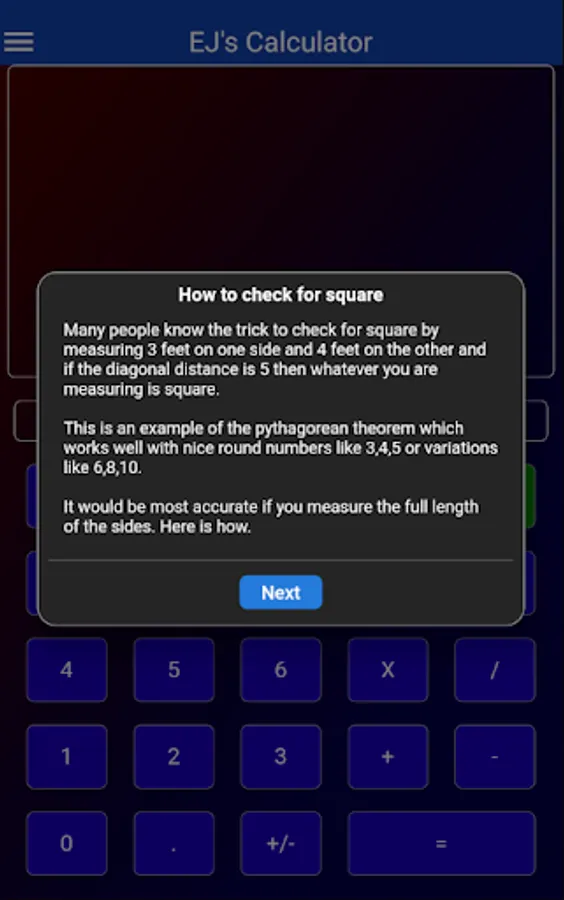 This app allows you to measure the full distances of whatever you are checking and it will calculate what the diagonal value should be.