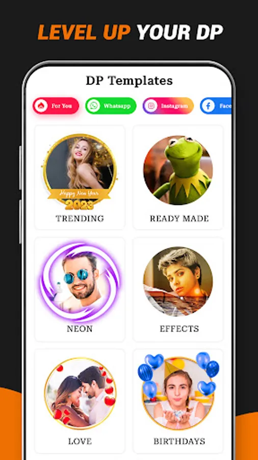 • Variety of dp maker, profile picture border frames with photo editing tools including stickers, text styles, insta dp templates, etc.