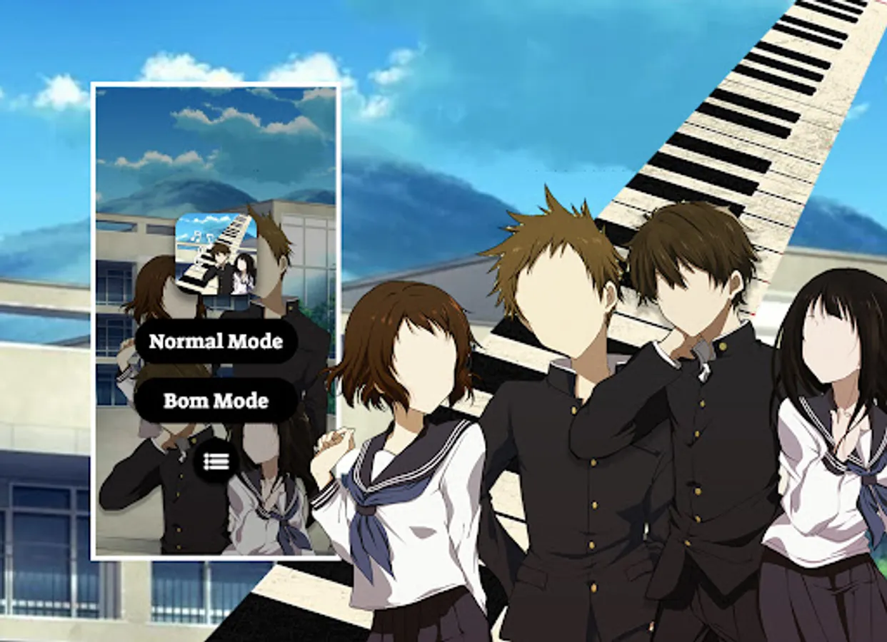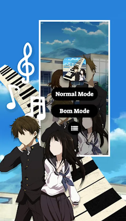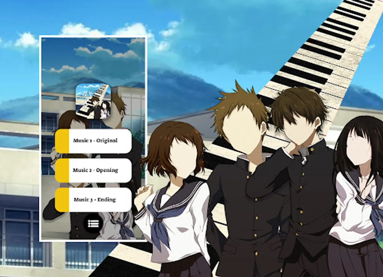 This app is made by Houtarou, Eru Chitanda, Mayaka, Fuyumi Irisu, Satoshi Fukube, Koreyuki Tani fans, and it is unofficial. The content in this app is not affiliated with, endorsed, sponsored, or specifically approved by any company. All copyright and trademarks are owned by their respective owners. This game just include piano instrumen from public website, this game create for fans and just entertain. If we are in breach of copyright, please let us know and it will be removed as soon as possible. Thank you so much.