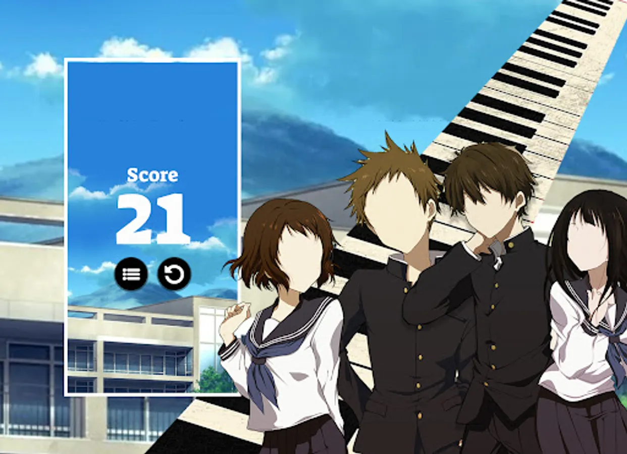 Piano Tiles Anime Games Hyouka Game is a small gift for all fans of Houtarou, Eru Chitanda, Mayaka, Fuyumi Irisu, Satoshi Fukube, Koreyuki Tani. This is an extremely interesting game and you will never be bored. Play Piano Tiles Anime Games Hyouka Game and show your friends the highest score you reach. We hope that the Piano Tiles Anime Games Hyouka Game will make you happy in your free time.
