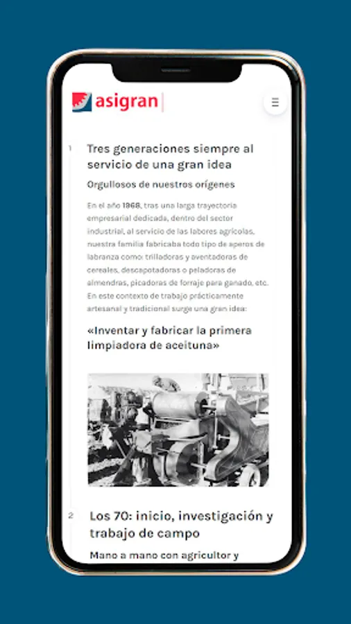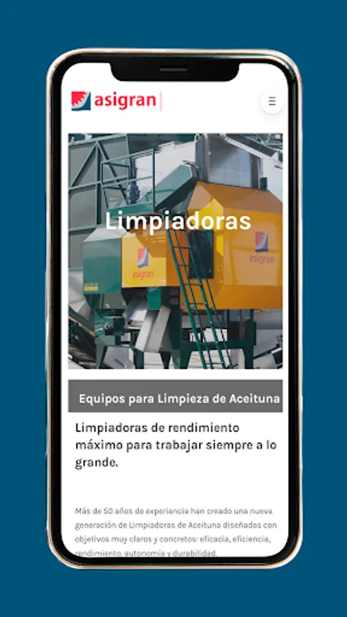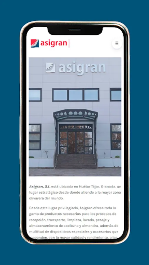 The Asigran app is created so that you have practically all the information on the entire range of machinery and main services that the company develops at your fingertips. Asigran, S.L designs, manufactures and installs all the necessary products for the process of receiving, transporting, cleaning, washing, weighing and storing mainly olives and almonds. With this app, in addition to accessing the most relevant information about this equipment, you can make any commercial or technical query you need, download our catalogs and request additional information.