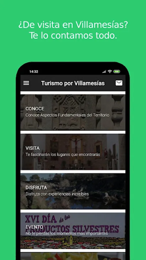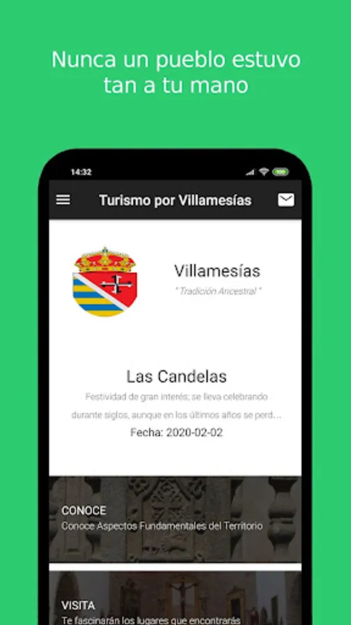 We show you Villamesías. The application has been designed for all audiences and tries to show the beauty and great things of the land, the festivities of its people and the services that tourists, travelers or pilgrims may need in their stay with us: accommodation, restaurants, bars, shops ...