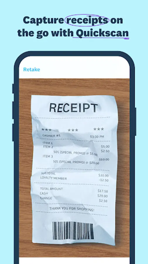 • Accurately capture and record receipts via Quickscan smart receipt scanner