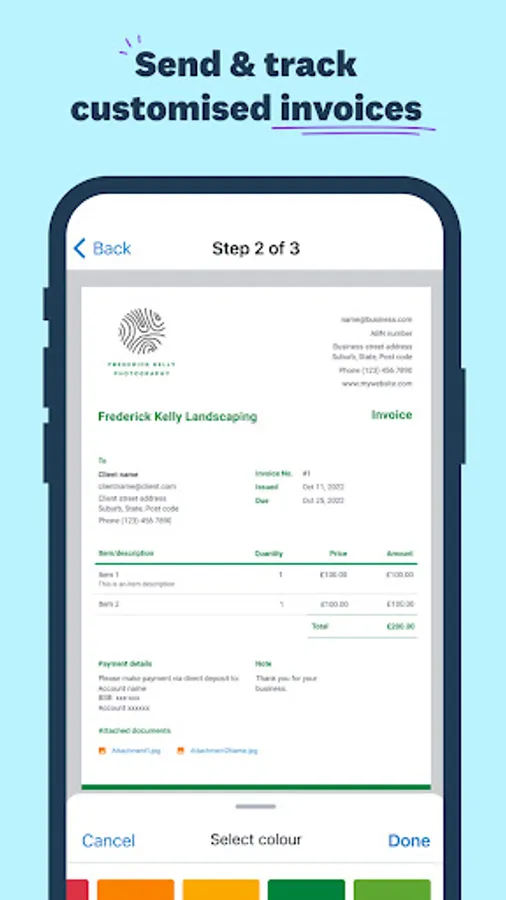 • Customise invoices with to reflect your brand and level up your business