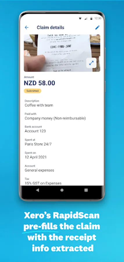 - Automatic receipt transcription: Details are scanned from your photo receipt to auto fill the expense claim