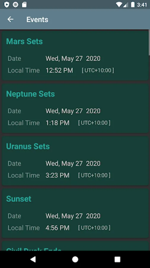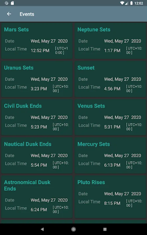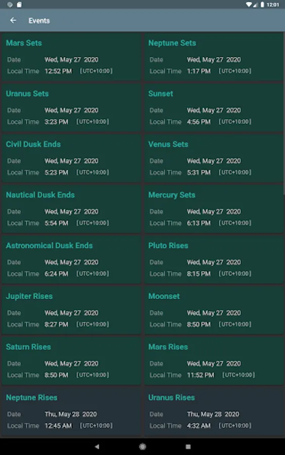 The times of upcoming phenomena are shown on the Events screen, including: