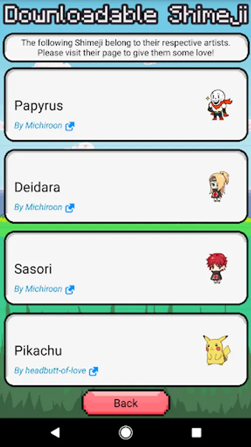 If you have a Shimeji image set to contribute and would like to add it to this app, please email the developer at xerophi@gmail.com. All Shimeji contributions are welcome and appreciated.