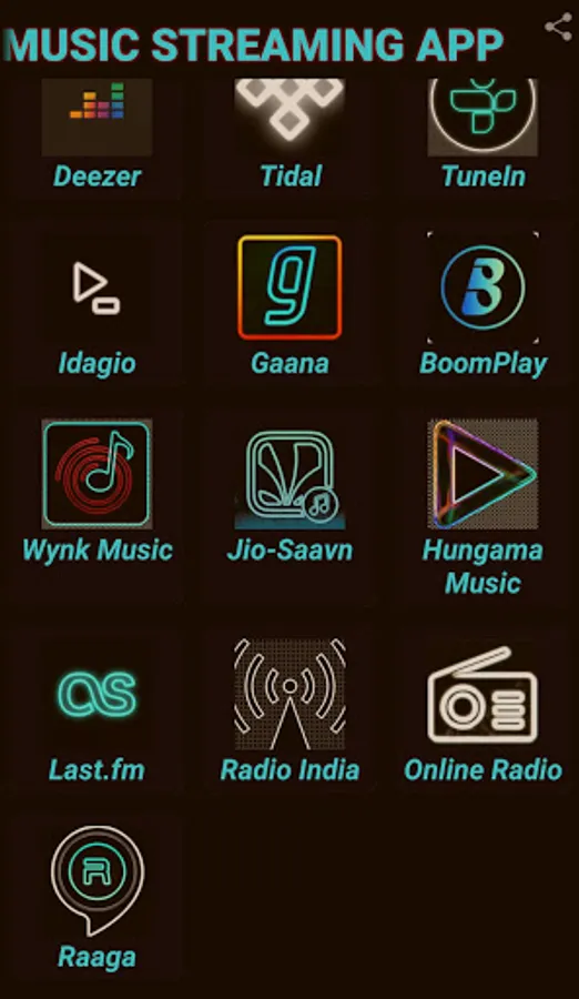 The app includes all the leading music streaming services like Spotify, Amazon Music, Apple Music , Gaana, Wynk Music, Jio Saavn, Tidal, Deezer etc. It als has all the radio stations of India and some other Radio streaming services like IHeart.